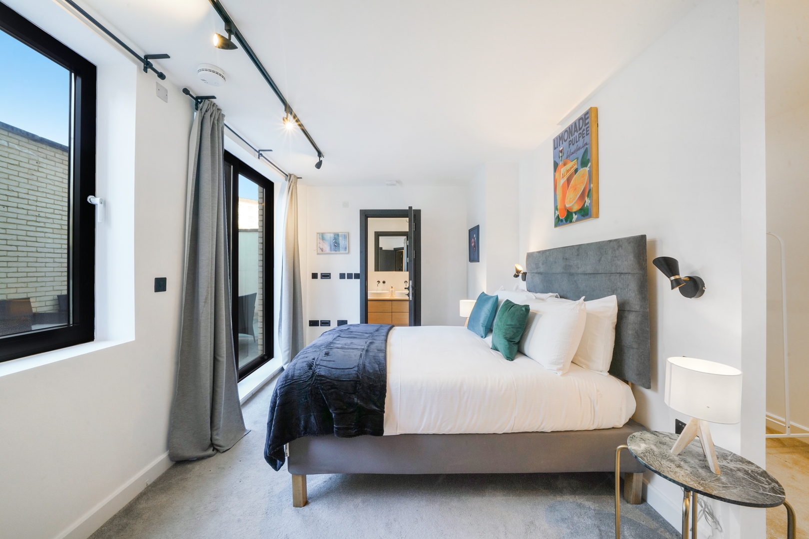 On the ground floor, there is an ensuite bedroom with a private bathroom, a UK King-size bed (200 x 150 cm), a spacious walk-in wardrobe, and bedside lamps.