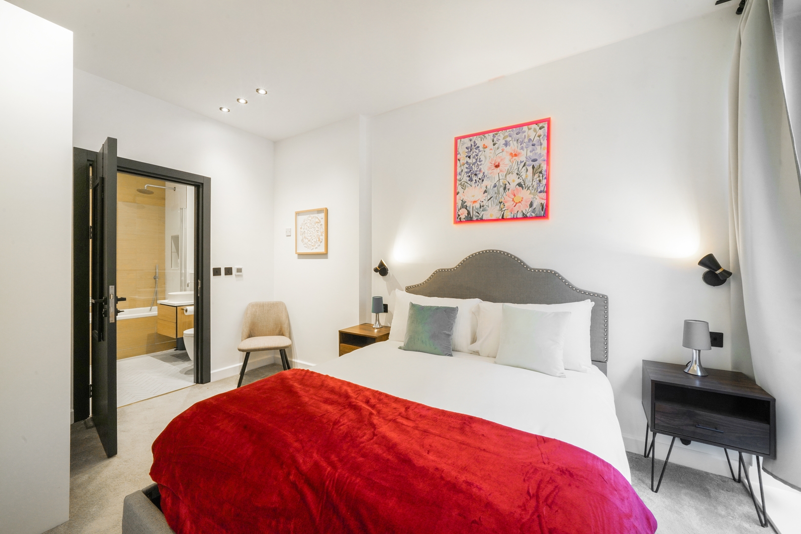 - Features a UK double-size bed (190 x 135 cm), a spacious wardrobe, and bedside lamps.